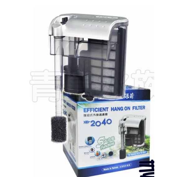 Shiruba 銀箭 強迫式外掛過濾器 XB-2040 A-556 商品介紹 1. 最佳過濾效果設計,直接將魚缸水導入密閉式過濾插卡中,水100%經過過濾棉,水中雜其留在插卡內。 2. 附有強弱水流調整功能,適用各類小型魚缸。 3. 防止空轉設計,當過濾器運轉中遇到停電時,可保留適量的水在濾槽內,再供電時將魚缸水再抽入過濾器繼續運轉。 4. 過濾器採用高級工程塑膠成型,外形美觀、結構堅固耐用。 商品規格 功率:4.5W 流量:360L/H 適用水缸:40cm以下 尺寸:14.9*11.5*16.3cm
