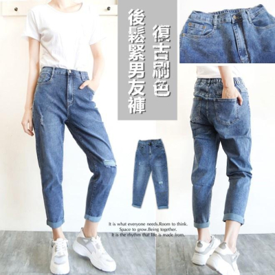 高腰顯瘦 後鬆緊男友褲 復古刷色 彈力鬆緊腰 寬鬆哈倫褲 刷破休閒褲 日系街頭 牛仔長褲【651-300】S~XL