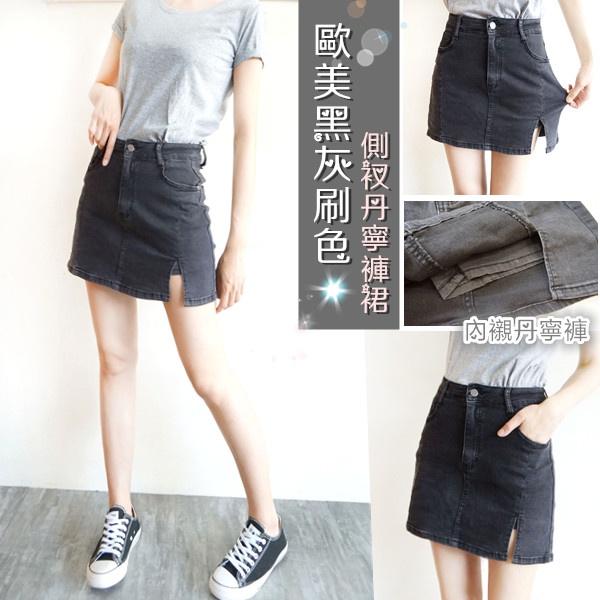牛仔褲裙 彈力牛仔裙 高腰顯瘦 牛仔短裙 黑灰色 百搭 性感開衩 歐美風【133-602】S~XL