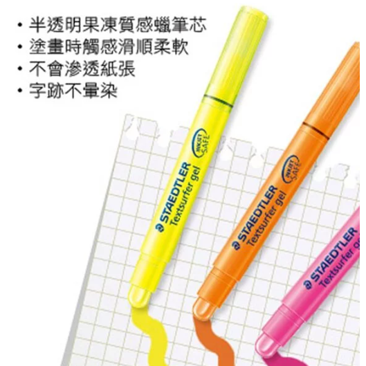 德國產品高品質 標示重點清楚 色彩鮮豔 圓頭使用滑順 上色後不易掉色 品名:STAEDTLER施德樓 果凍螢光筆(MS264) 顏色:黃、粉紅、橘、綠、藍 長度:13.7cm