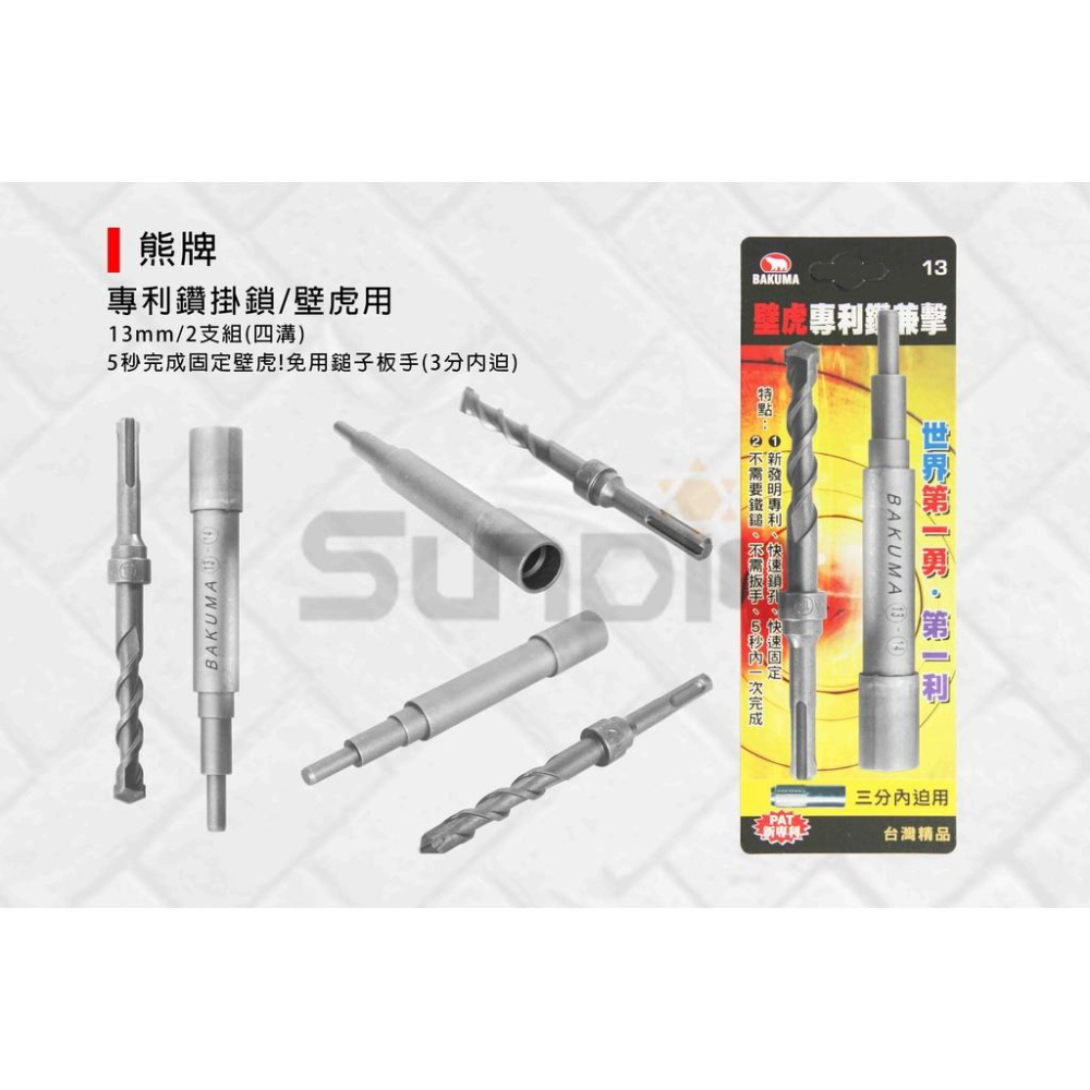 (燦光五金)專利鑽掛鎖/壁虎用/3分內迫/鑽掛鎖/鑽兼鎖/固定壁虎/免用鎚子板手 13mm/2支組(四溝)熊牌