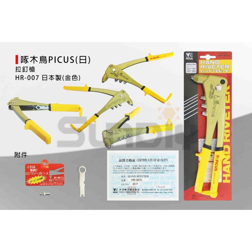 (手工具-槍)啄木鳥PICUS(日) 拉釘槍/手動拉釘槍/鉚釘槍(可拉白鐵)-(HR-007L)金色