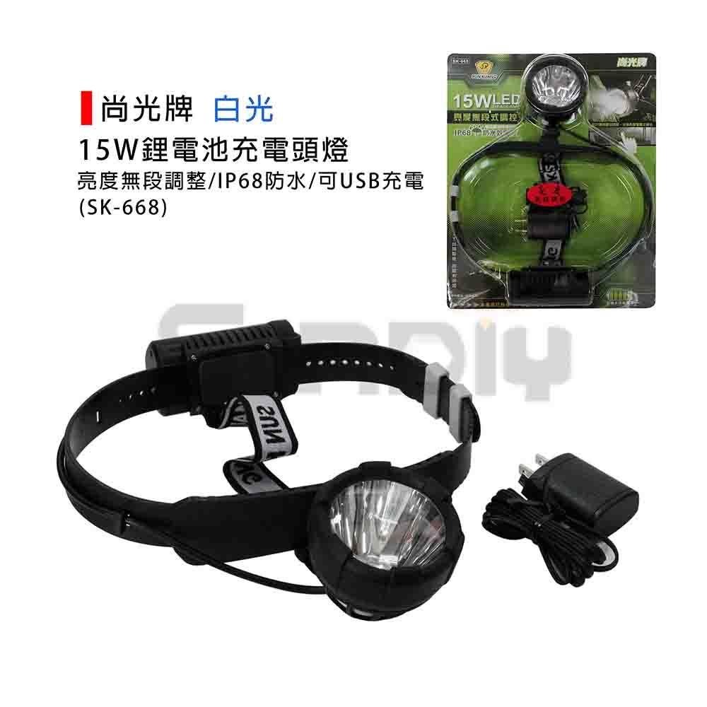 (電工)尚光牌 15W高亮度LED頭燈/鋰電池充電頭燈)(SK-668)硬帶-白光/黃光(IP68防水效果)