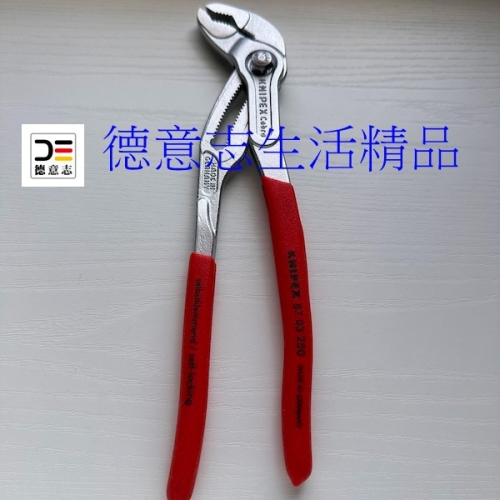使用 Knipex Cobra 水泵鉗時,其優勢顯而易見:這款水泵鉗輕巧而堅固,只需輕按按鈕即可快速調節以適應工件,並可自動鎖定管道和螺母。 Cobra 87 03 250 採用鍍鉻工藝,具有卓越的防銹性能。手柄表面覆有防滑塑膠。