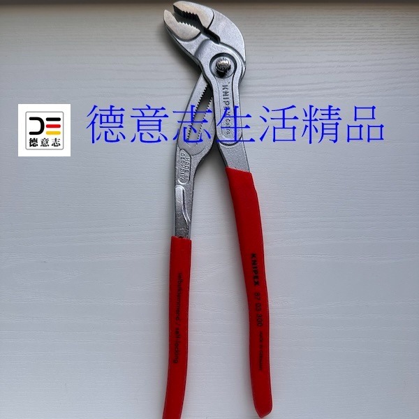 Knipex Cobra 87 03 300 是一款長度為 300 毫米的水泵鉗,是 Knipex Cobra 系列中尺寸較大的型號之一。它扭力更大,夾持範圍可達 70 毫米,特別適合那些覺得經典 250 毫米 Cobra 鉗子容量不夠的專業用戶。這款水泵鉗的優點在使用時便顯而易見:它可以快速定位到工件上,並具有自鎖功能,例如可以牢固地夾持管道和螺母。 Knipex Cobra 87 03 300 的塑膠塗層手把提供了牢固的防滑握感。它非常適合用於直徑最大為 2 ¾ 英吋(70 毫米)的管道,以及最大扳手尺寸為 60 毫米的螺母。鍍鉻表面具有出色的防鏽性能,使其成為將工具放在車內的維修技師的理想之選。鍍鉻層可以防止因溫度波動引起的冷凝等因素造成的腐蝕。