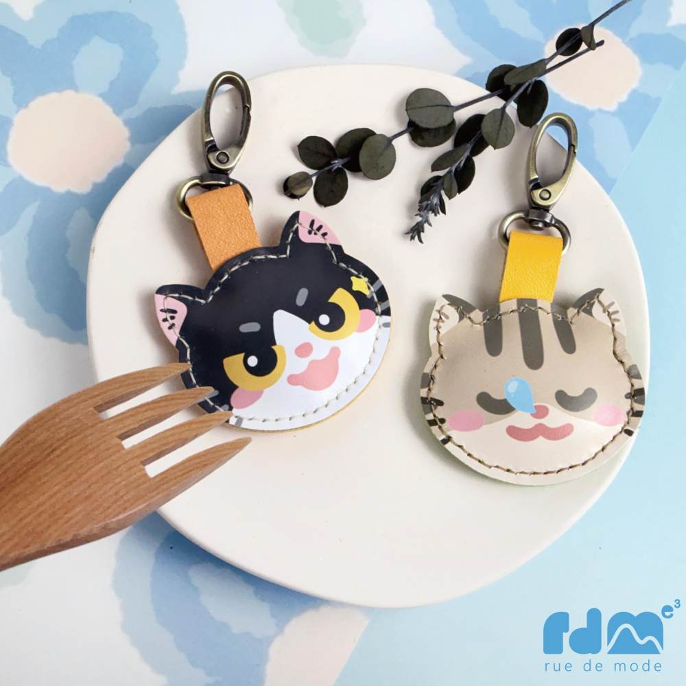 以可愛貓咪為靈感打造的印刷皮革鑰匙圈,由插畫家親自繪製角色造型,再由麥子庇護工場的身心障礙夥伴手工縫製完成。