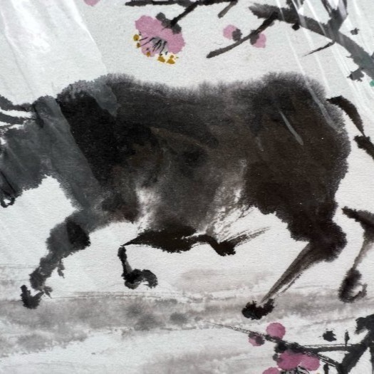 柏弘原創日式風格民國早年畫作27x24cm六合貴人三合貴人12生肖牛粉紅櫻花樹下嘻戲照片為實物非電腦複印