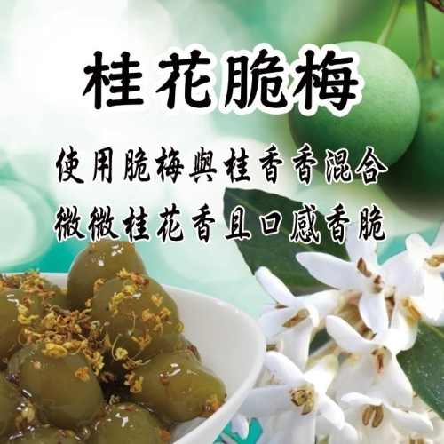 內容物:梅子、桂花汁(果糖糖漿、砂糖、水、香料、果膠、桂花、玉米糖膠、己二烯酸鉀(防腐劑)、偏磷酸鈉、醋磺內酯鉀(甜味劑)、焦糖色素)、糖、鹽