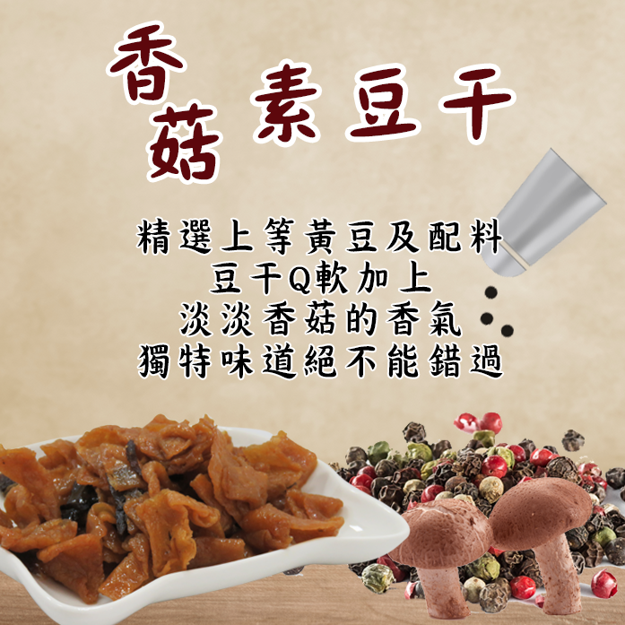 成份:黃豆(基因改造)、砂糖、甘油(食品製造用劑)、麥芽糖、大豆沙拉油、鹽、香菇粉、調味劑(L-麩酸鈉)、己二烯酸鉀(防腐劑)、甘草粉、素肉粉(香料、麥芽糊精、食鹽、酵母抽出物、小麥水解蛋白、蔗糖、高麗菜抽出物、黃豆水解蛋白)、乳酸、檸檬酸、硫酸鈣、脂肪酸甘油酯、 卵磷脂、碳酸鎂、矽樹脂