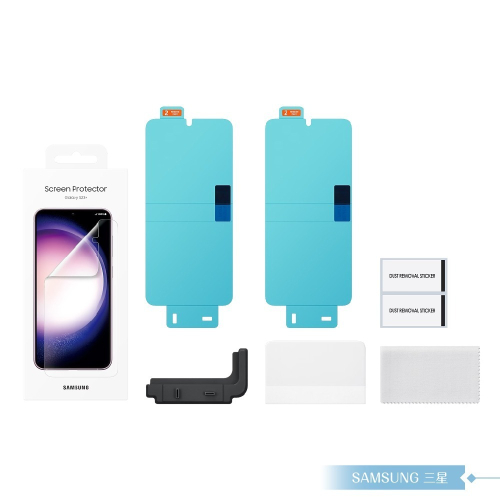 盒內配件:Galaxy S23+ 螢幕保護貼 x 2片、除塵貼 x 2張、刮刀、超細纖維布、輔助工具 、快速入門手冊