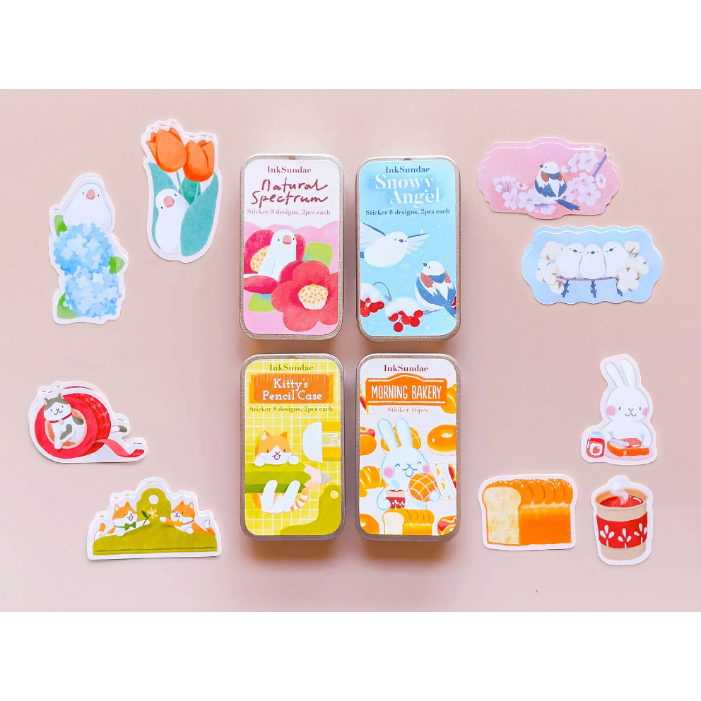 【鐵盒4款】Inksundae 迷你鐵盒貼紙組「雪國精靈/貓咪的筆袋/早安麵包店/繁花色票」【立夏手帳生活】