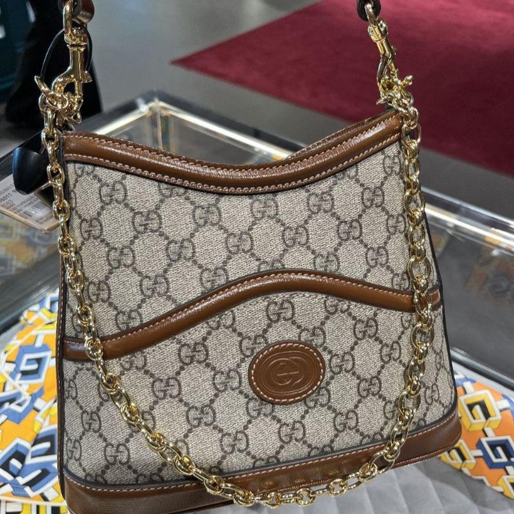 二手99新GUCCI 古馳女包經典老花Logo扁水桶包帆布牛皮鏈條單肩包手提包