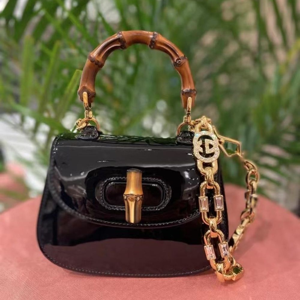 二手99新 GUCCI古馳23新款Bamboo 1947系列女士迷你黑色漆皮單肩手提包