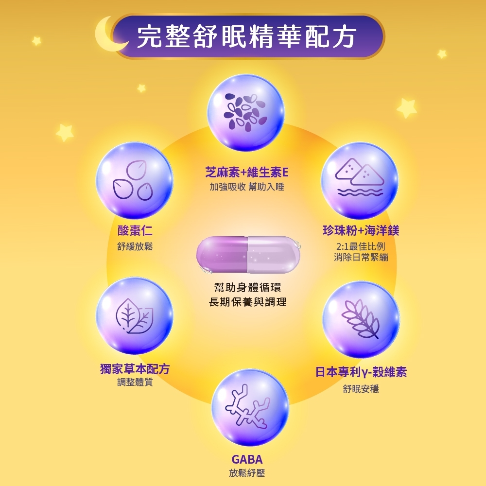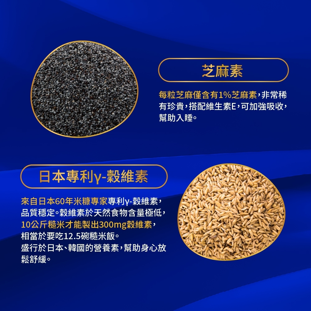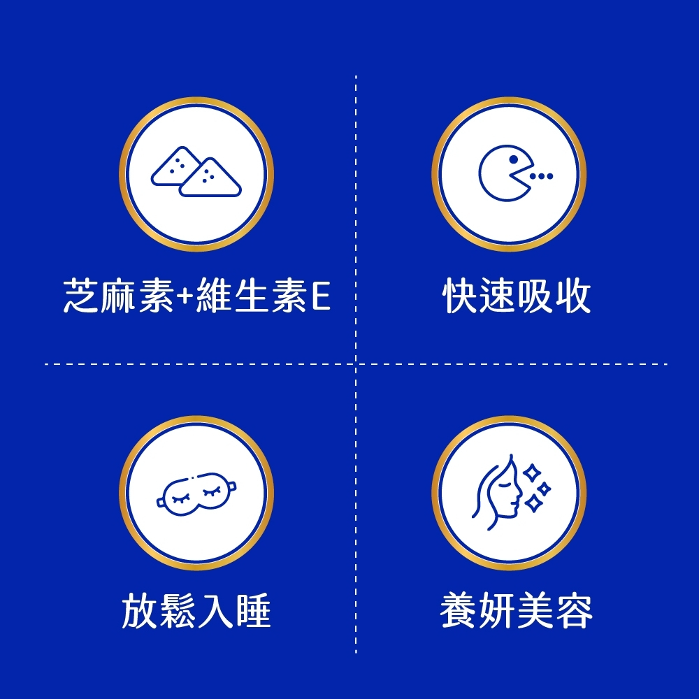 低溫冷封充填液態膠囊,完整保留芝麻素營養價值;與維生素E的協同作用,讓功效發會到極致,幫助入睡。
