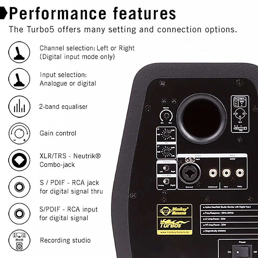 來自德國專業Monkey Banana Turbo 5 監聽喇叭是一款主動式的數位雙功放驅動監聽喇叭,非常適合在中小型監聽環境中進行完美混音和母帶處理。