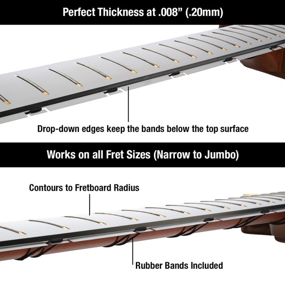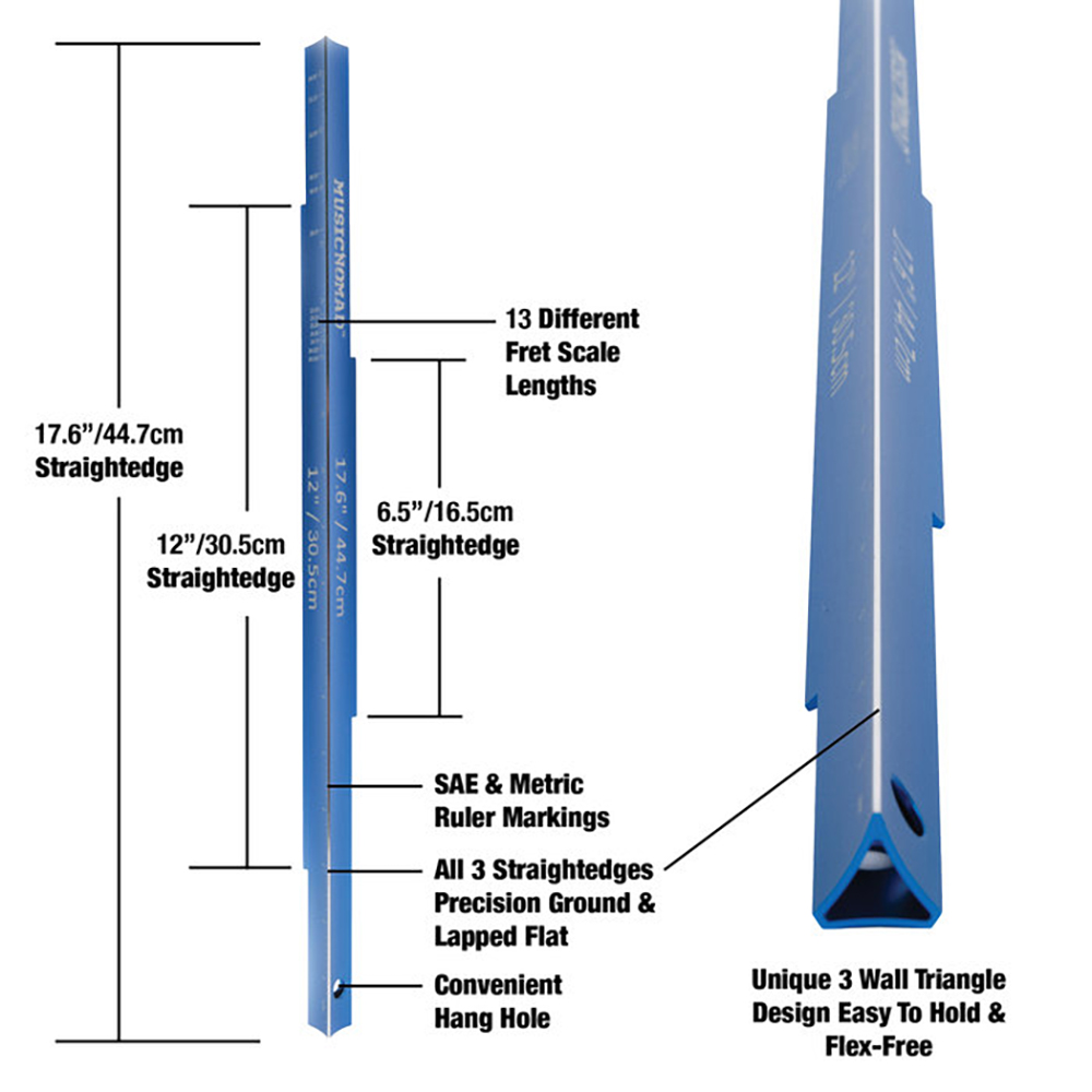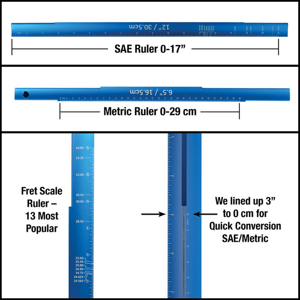 指板三角量尺有「標準(SAE)」和「公制」標記加上 13 個最常見的吉他和Bass音階長度,可快速檢查您正在使用的有效弦長。