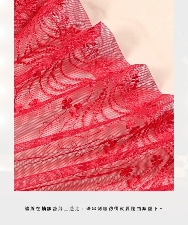 繡線遊走皺褶蕾絲 珠串隨曲線垂落