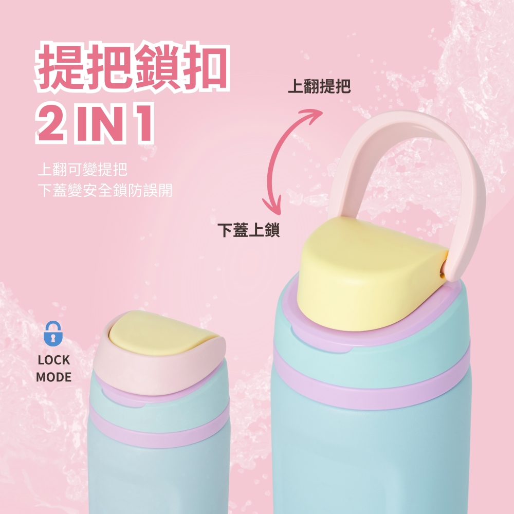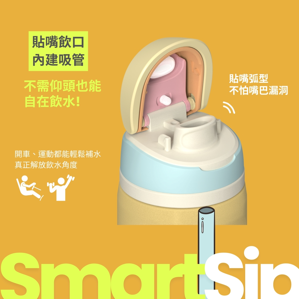 • 貼嘴飲口內建吸管,不須仰頭就能自在飲水
