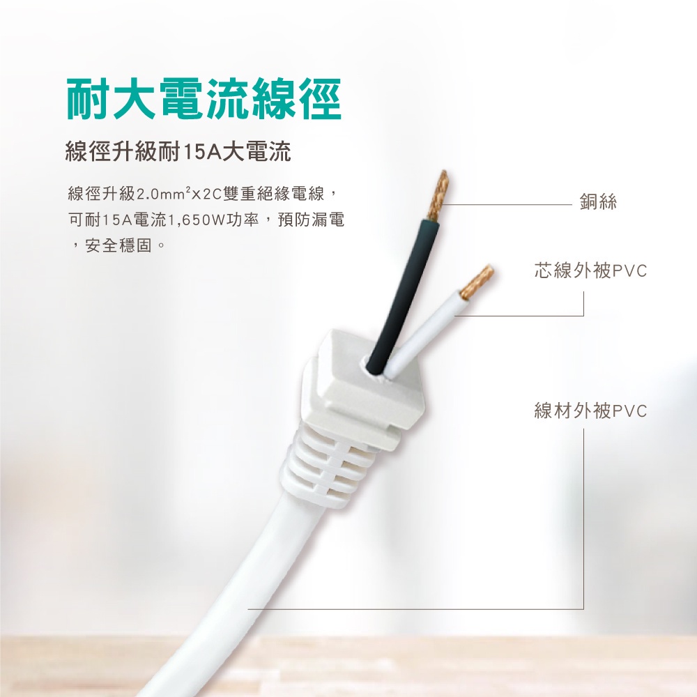 ✅雙重絕緣電線,預防漏電,可耐15A電流1,650W,安全穩固