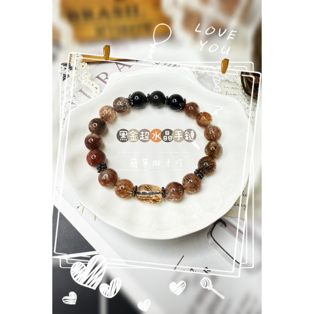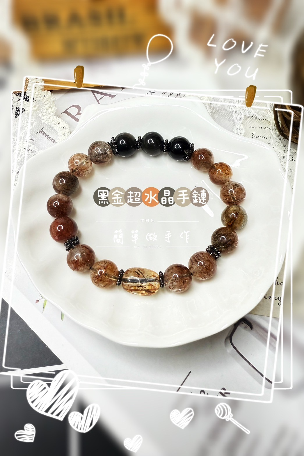 黑金超是水晶界的新寵兒。在水晶裡共生黑金色與金銅色的絲礦,於光線照射之下,它會閃耀出燦爛的光芒,與單色系的「鈦金」、「銅鈦」等類似的水晶中,其最大的不同在於「雙色性」,一顆晶體同時擁有黑金與銅金的光芒。內含黃磷鐵礦、金紅石、針鐵礦、纖鐵礦,而所謂的上品,就是要絲多、綿少、晶體淨透,如果絲少,閃耀度也會減少,綿多,會掩蓋閃耀度,晶體淨透會增加絲體閃耀的光輝。