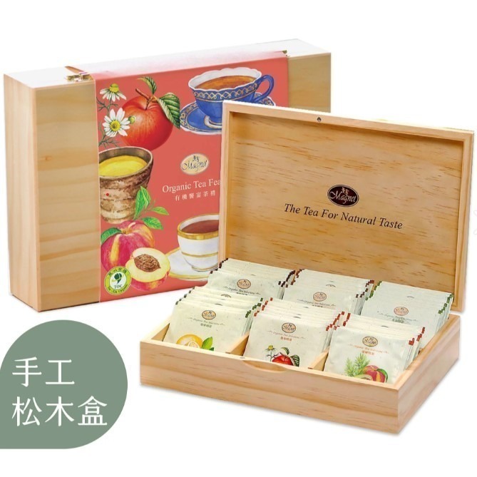 內容物: 有機皇家錫蘭紅茶8茶包、有機經典伯爵茶8茶包、有機經典綠茶8茶包、 有機清檸康福茶8茶包、有機蜜蘋舒緩茶8茶包、有機蜜桃國寶茶8茶包