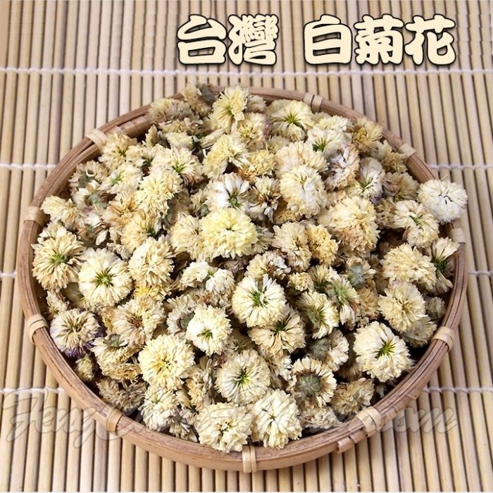 *白菊花尺寸:長度約2cm~2.5cm不等,顏色為白綠色。 *外包裝:夾鏈袋密封裝。 *重量:300~600公克±5%。 *產地:台灣 苗栗 *菊花茶 • 材料:乾燥菊花少許。 •作法:將少許乾燥菊花洗淨,放入茶壺,然後加入熱水沖泡即可飲用。 菊花茶 •材料:荷葉一片 . 山楂少許 . 乾菊花少許 . 洛神花3-5朵 • 作法 : 1.將所有材料置於杯內,以熱開水沖泡。 2.約等三分鐘,讓洛神花入味後即可。 •說明: 1.另可加少許玫瑰花.甘草或蜂蜜 •沖泡花茶的小祕方: 1.花茶之泡法全部用溫水(約60度)沖泡。(以免破壞其成份,花茶不像一般的茶葉可耐高溫) 2. 沖泡5分鐘後,花及茶水必需分開,以免茶水之花味濃度太高。 3. 沖泡花茶非必要,不要加糖,如需要可加蜂蜜或楓漿