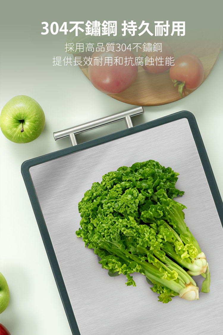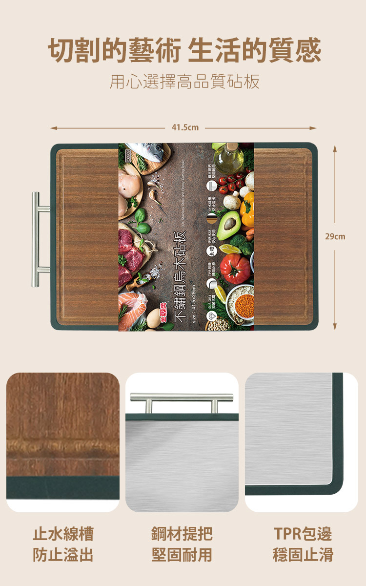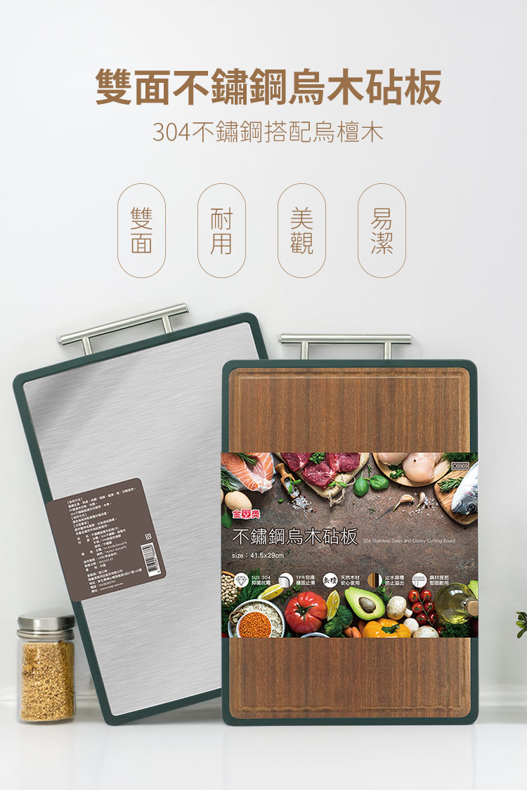 ◆烏木面適合切魚、肉類;304不鏽鋼面適合切蔬菜、水果。