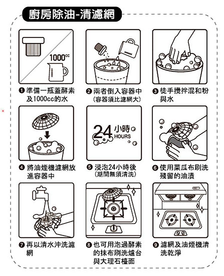 4、排油煙機濾網等頑強污垢,建議可浸泡後清潔,效果更佳。
