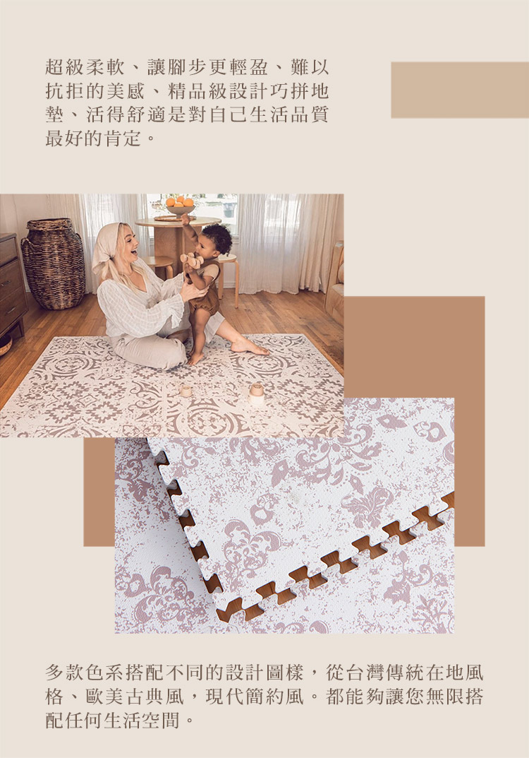 ※ 當您組裝花紋設計的地墊邊條時,只要隨著花紋的對襯花色調整拼接的位置,就能完成您心中最美的地毯式圖案。
