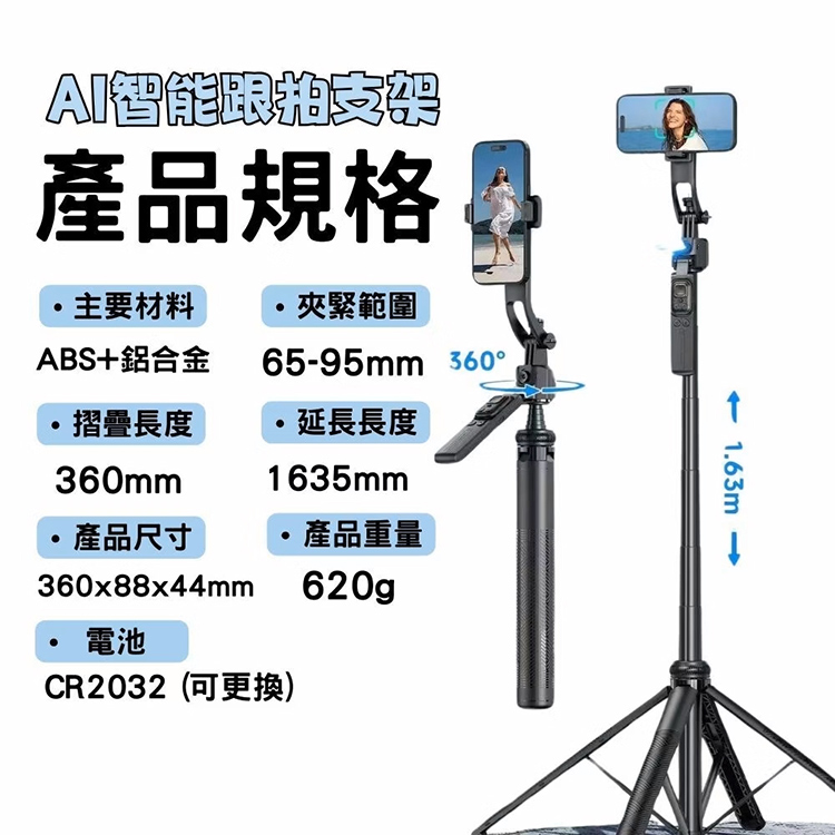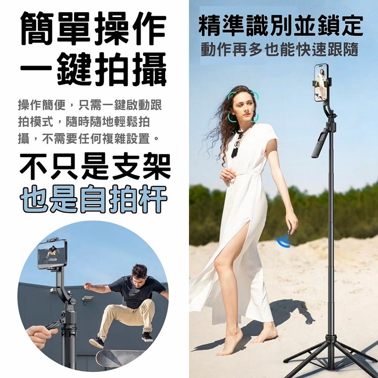 解放雙手,無需他人協助,輕鬆享受智慧拍攝體驗!搭載先進的AI智能技術,這款AI智能跟拍支架能自動偵測並精準鎖定拍攝對象,實現360度全方位旋轉跟拍。不論你在運動、直播、還是拍攝家庭合照,它都能輕鬆捕捉你的每個精彩瞬間。讓你的每一個動作都成為鏡頭中的焦點!