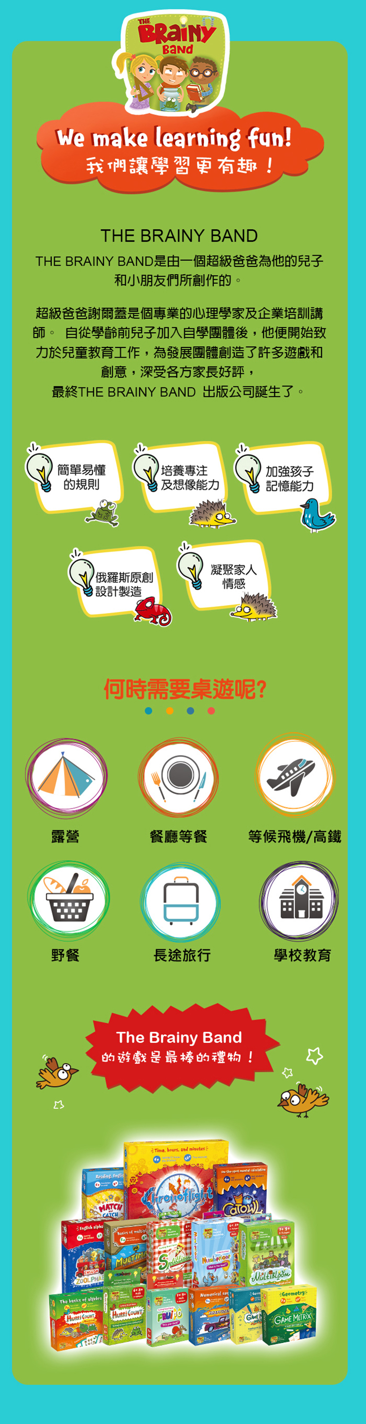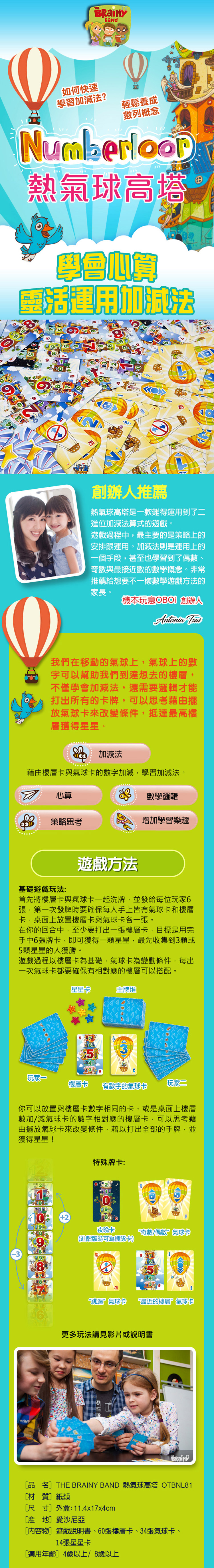 《機本玩意OBOi 數學邏輯桌遊-熱氣球高塔(The Brainy Band)》是一款專為4歲以上兒童設計的數學邏輯桌遊,適合2至5人參與,遊戲時間約為15分鐘。此桌遊幫助孩子透過遊戲進行數列概念、心算以及加減法的訓練,增加他們對數學學習的興趣。親子或朋友間可藉由這款桌遊增進情感,同時激發孩子的數學邏輯思維能力。