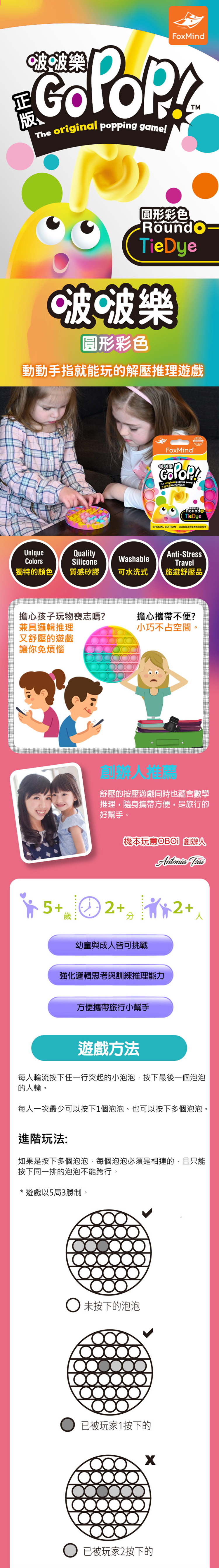 《機本玩意OBOi 數學邏輯桌遊-啵啵樂圓形彩色(Go PoP/FoxMind)》是一款專為5歲以上兒童和成人設計的解壓推理遊戲。玩家可以透過簡單的按壓操作來進行遊戲,不僅具有解壓效果,還能夠強化邏輯思維和推理能力。這款遊戲適合2人進行,遊戲時間約5分鐘,非常適合快速的休閒娛樂。