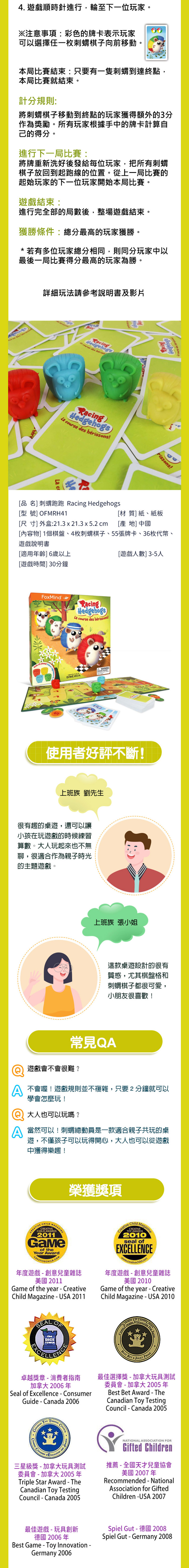商品內容:1個棋盤、4枚刺蝟棋子、55張牌卡、36枚代幣、遊戲說明書