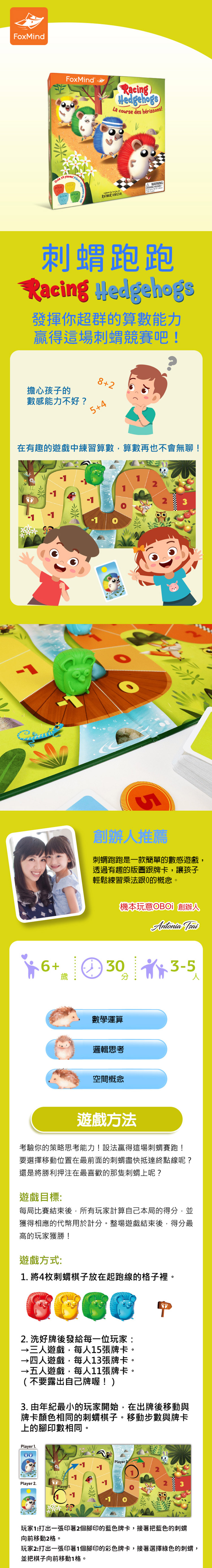 《機本玩意OBOi 數學運算桌遊-刺蝟跑跑(FoxMind)》是一款專為6歲以上兒童設計的數學運算桌遊,適合3到5人共同遊玩,遊戲時間約30分鐘。這款遊戲結合了數學與策略,讓孩子在有趣的互動中提升數學運算能力。