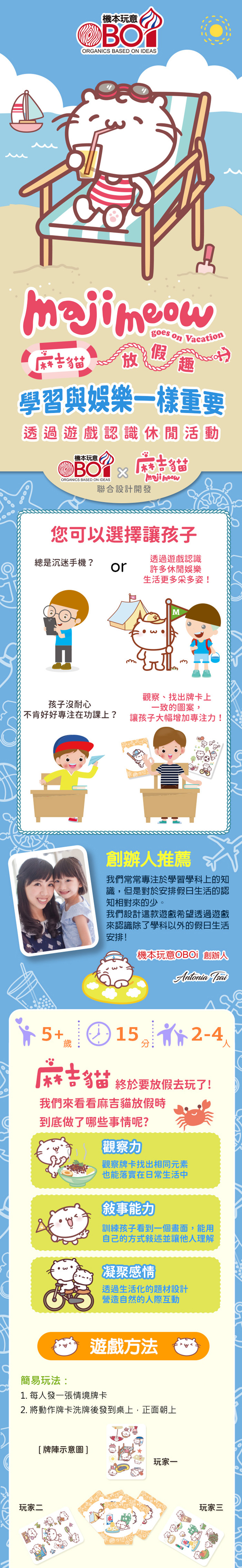 《機本玩意OBOi 觀察力訓練桌遊-麻吉貓放假趣》是一款專為5歲以上玩家設計的桌遊,適合2至4人進行,遊戲時間約15分鐘。這款遊戲旨在通過有趣的互動方式培養孩子的觀察力和敘事能力。