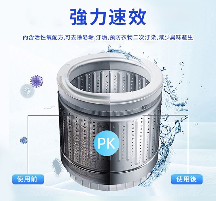 適用於洗衣機槽清除髒汙,使水槽維持潔淨無異味。