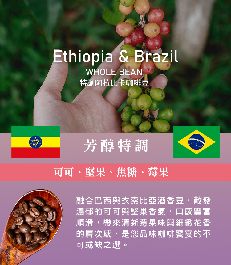 融合巴西與衣索比亞酒香豆,散發濃郁的可可與堅果香氣,口感豐富順滑,帶來清新莓果味與細緻花香的層次感,是您品味咖啡饗宴的不可或缺之選。