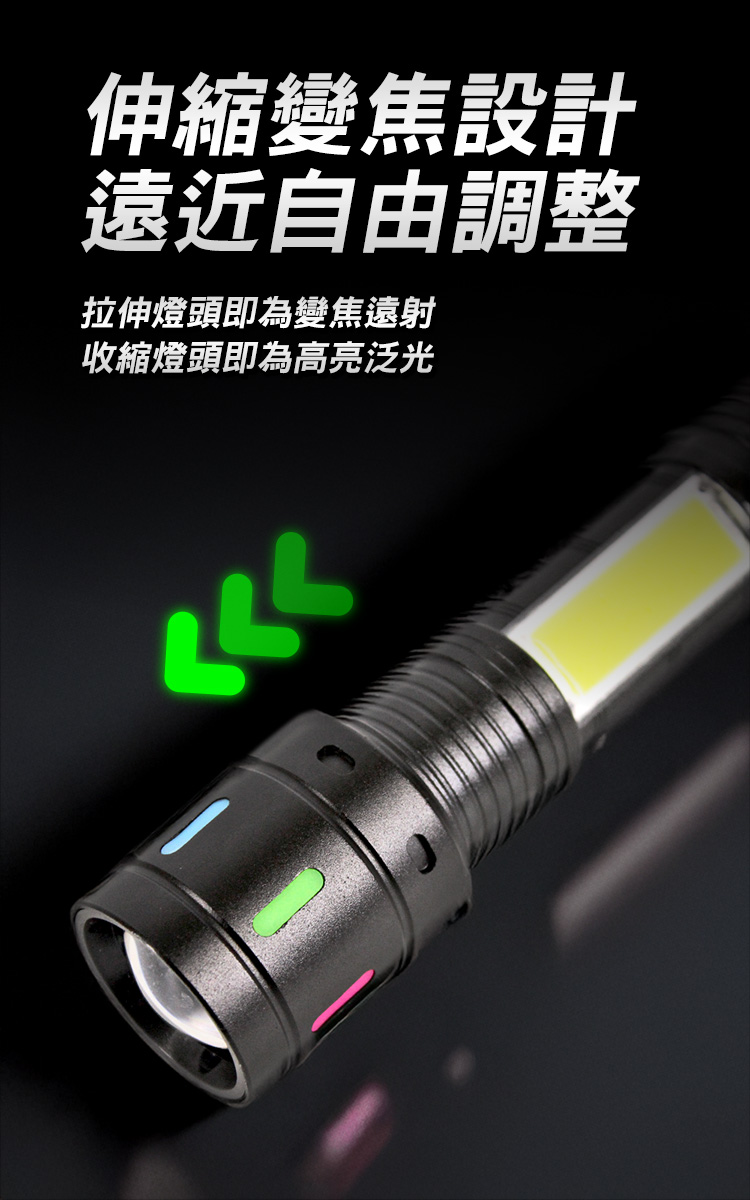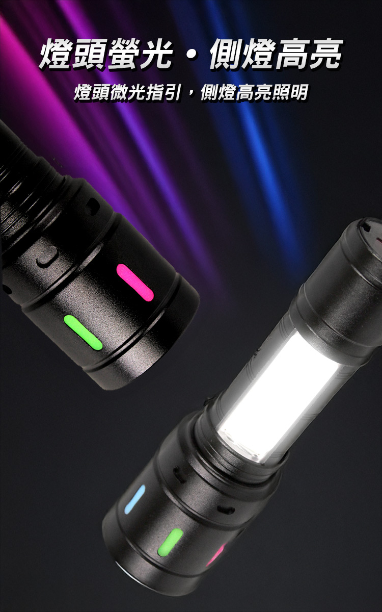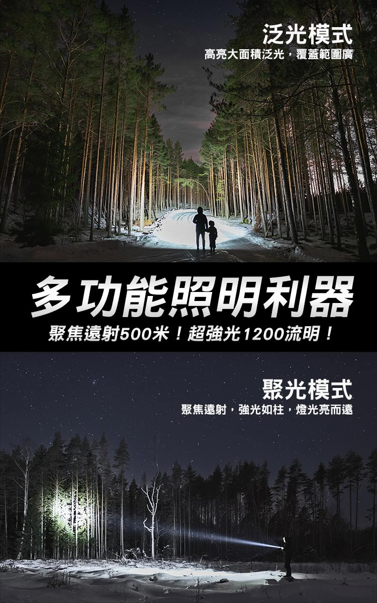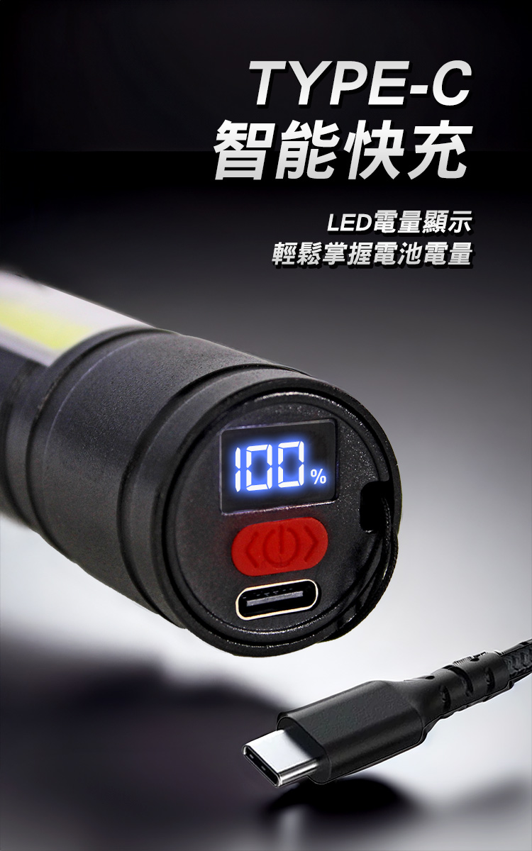 暗夜瑩光 20W LED 多功能手電筒(TYPE-C/充電式/聚焦遠射500米/四段調光/電量顯示)