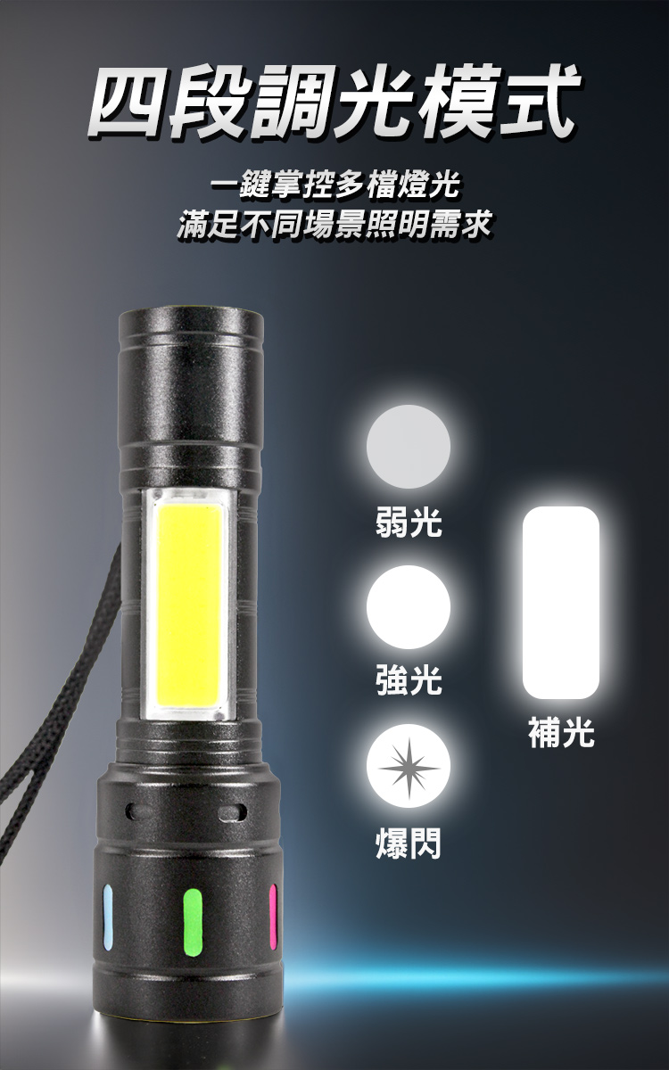 ◆四段式調光:強光、弱光、爆閃光、側燈,自由選擇所需模式。