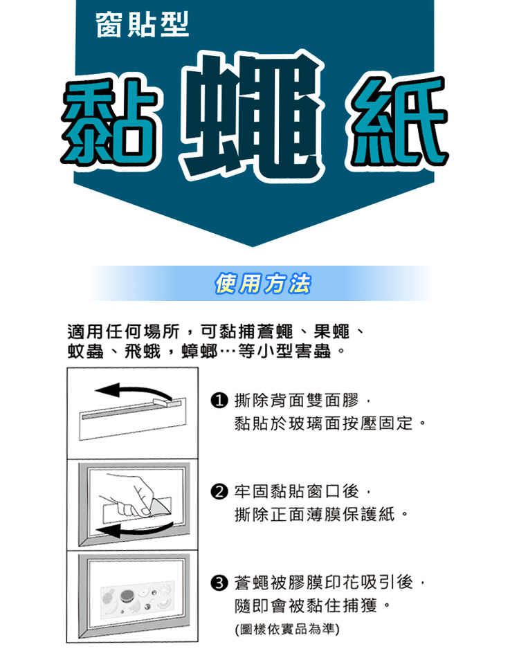 3.蒼蠅被膠膜印花吸引後,隨即會被黏住捕獲。(圖樣依實品為準)