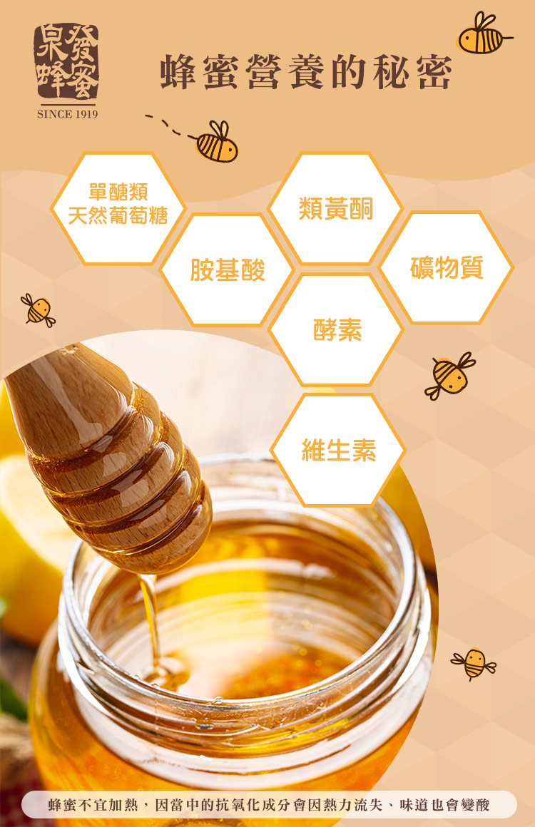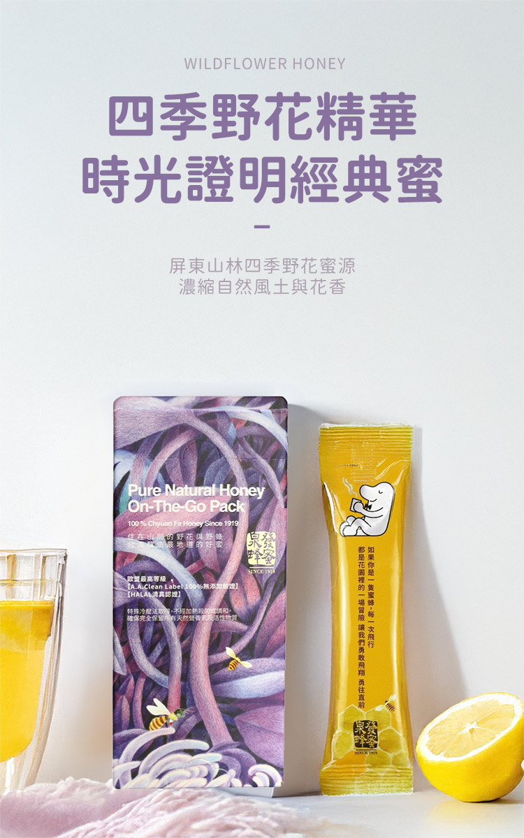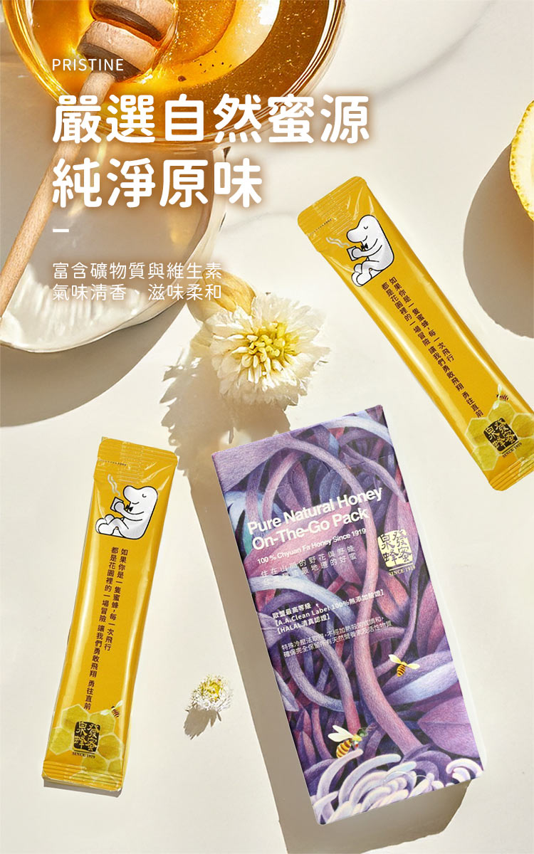 蜜蜂天性敏感,避開農藥殘留的花朵,所釀成的蜂蜜天然純淨、無化學污染,為日常補充活力的自然良伴。