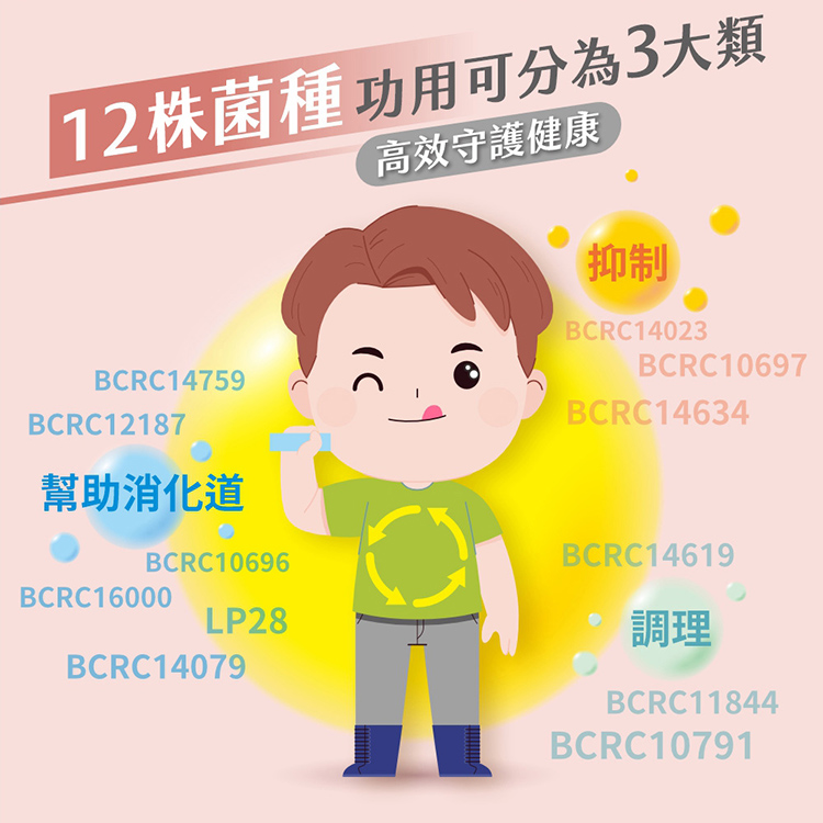 草莓風味-乳酸菌粉(乳糖、Lactococcus lactis乳酸乳球菌(BCRC10791)、Lactobacillus plantarum植物乳桿菌(LP28)、Lactobacillus rhamnosus GG鼠李糖乳桿菌(BCRC16000)、Lactobacillus paracasei副乾酪乳桿菌(BCRC14023)、Lactobacillus salivarius唾液乳桿菌(BCRC14759)、Lactobacillus acidophilus嗜酸性乳桿菌(BCRC 14079)、Lactobacillus bulgaricus保加利亞桿菌(BCRC 10696)、Lactobacillus casei乾酪乳乳桿菌(BCRC10697)、Lactobacillus gasseri加氏乳桿菌(BCRC 14619)、Lactobacillus brevis 短桿乳桿菌(BCRC12187)、Bififibacterium bifidum雙叉雙歧桿菌(BCRC11844)、Bifidobacterium longum長雙歧桿菌(BCRC14634)、脫脂奶粉、麥芽糊精、糖粉、檸檬酸、維生素C、木寡糖、優格香料粉)、草莓果汁粉(砂糖、麥芽糊精、草莓濃縮汁、氧化澱粉(樹薯)、檸檬酸、檸檬酸鈉、香料、蘋果酸、紅甜菜汁、婀娜多色素)