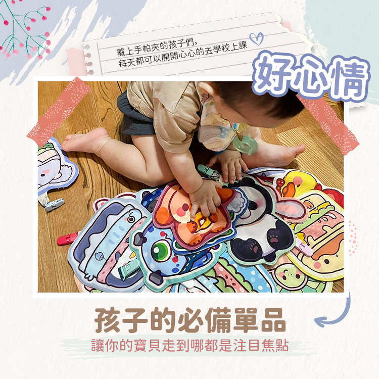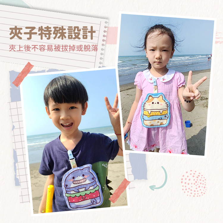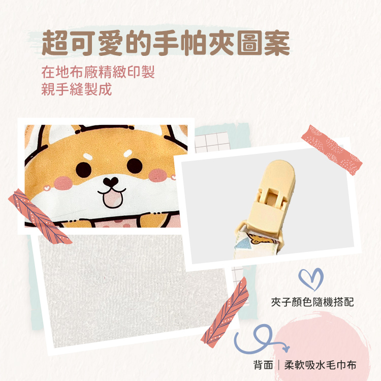 每一件手帕夾都是使用同一款布料手工剪裁,因此圖案位置皆略有不同。這也讓每一件作品,都成為專屬於孩子的限定版!