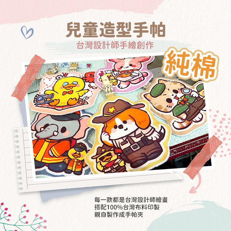 這些超可愛的手帕夾圖案,全都出自台灣設計師手繪創作,再經由在地布廠精緻印製,最後親手縫製成獨一無二的手帕夾。