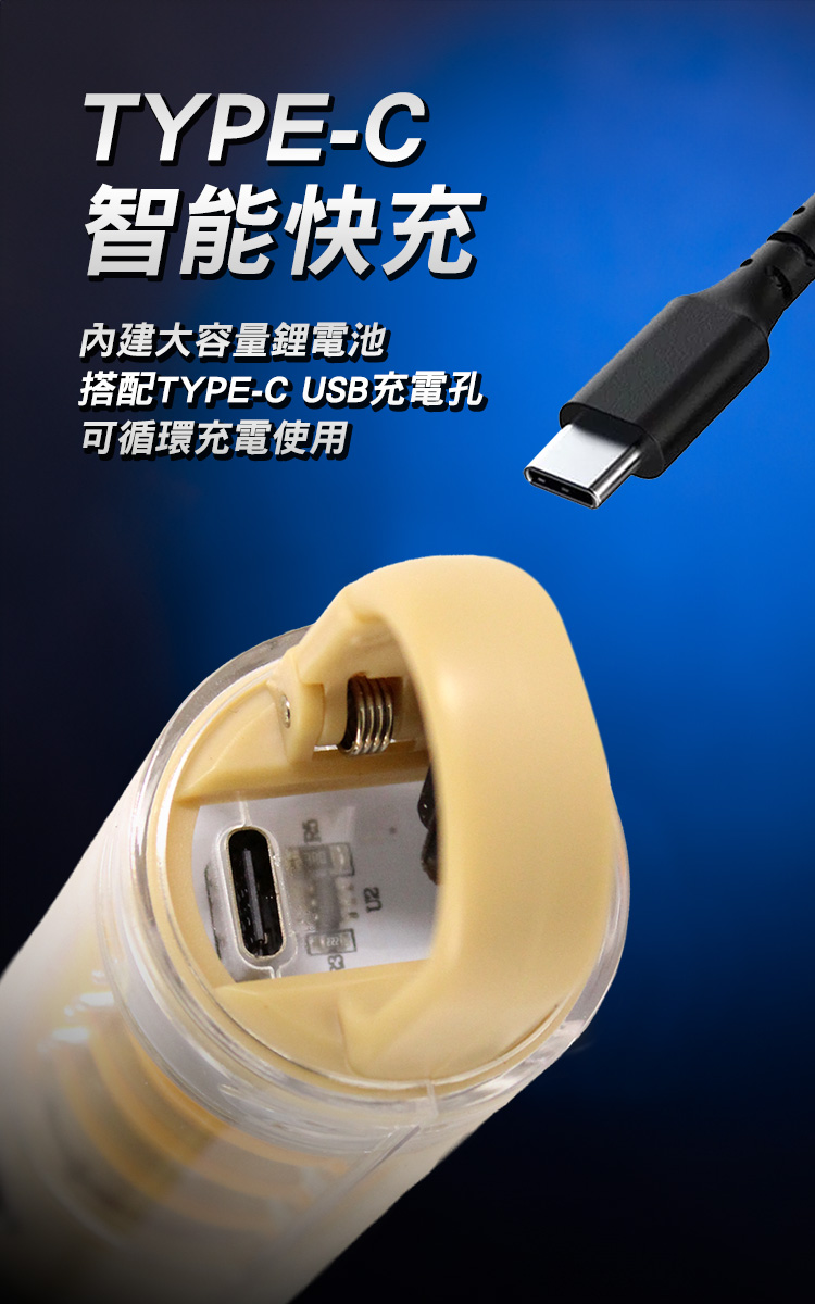 ◆內建大容量鋰電池,搭配TYPE-C USB充電孔,可循環充電使用。