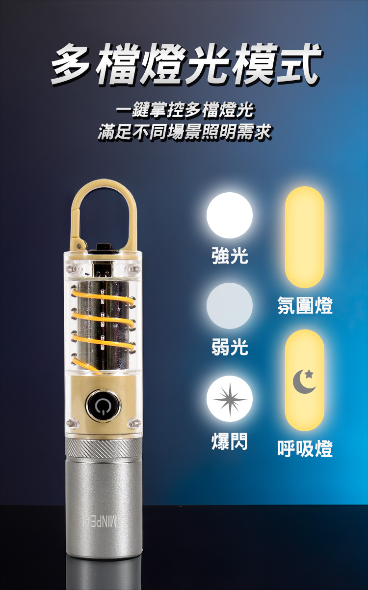 ◆五段式調光開關:強光、弱光、爆閃光、氛圍燈、如呼吸般情境燈,自由選擇所需模式。
