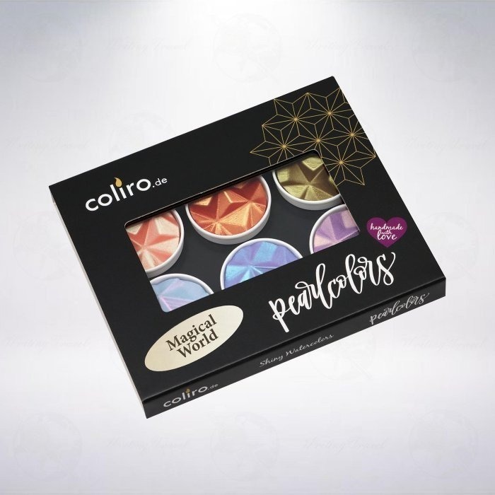 「魔法世界/Magical World」水彩粉餅組內含6種特別的顏色,包含飛馬(Pegasus)、鳳凰(Phoenix)、蛇怪(Basilisk)、小精靈(Pixie)、賽蓮(Siren)、巨狼(Fenrir),使用在黑紙和白紙,展現不同顏色,彷彿變魔術般的神奇。