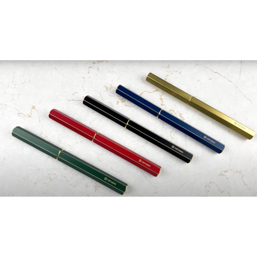 純粹而簡約的設計,六角筆身源自於鉛筆,我們想喚回你第一次拿筆時的興奮,找回初次畫畫及書寫的感動。探尋初心,回歸設計的本質,有所突破並保有經典,一款真正純粹的精美鋼筆。六角筆身由實心黃銅切削而成,並配有漂亮的鍍金筆尖,外覆有霧面烤漆,於六條邊角細細研磨出黃銅金線。筆尖上的圖案呼應六角筆身,簡約大器,幅度也較寬,讓書寫時手感豐沛滑順、視覺更滿足。尺寸有F尖與M尖共2種粗細選擇,足以應付日常書寫的需求。共有五色:綠色、紅色、黑色、藍色和黃銅(圖一左至右)。