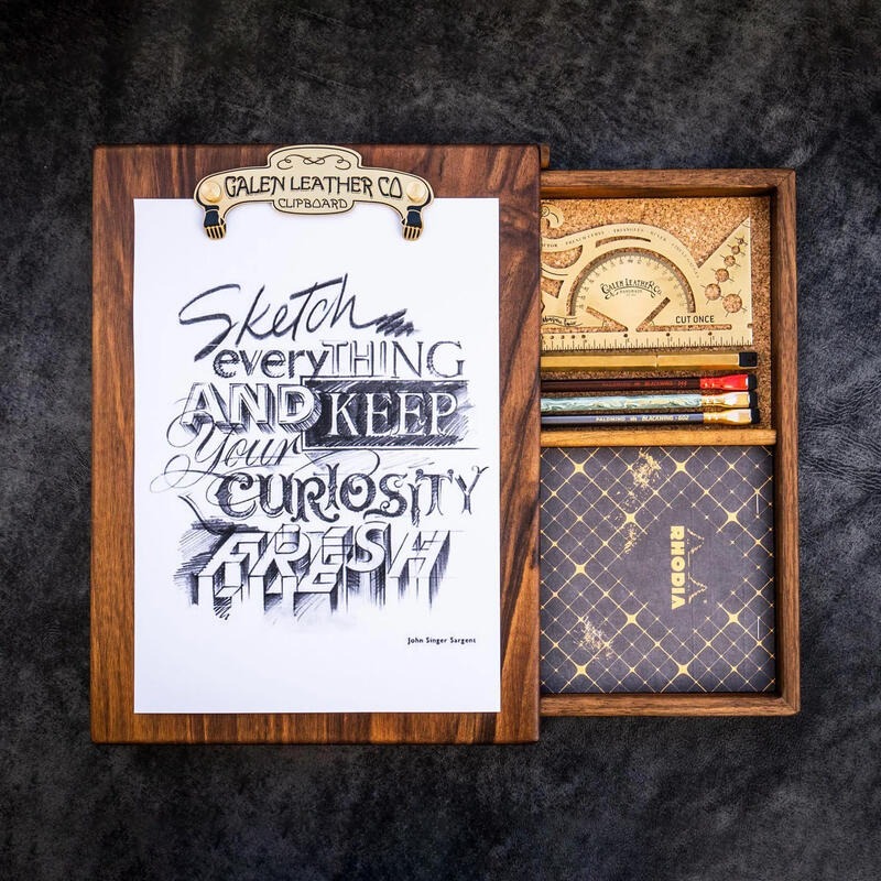 如果你是一位熱忱的藝術家、漫畫家、平面設計師或是愛好者,那麼你一定會喜愛這款獨特設計的木質素描盒。它由高品質的堅固耐用胡桃木手工製作,便於隨身攜帶出行。素描盒內設有一個可完全打開的抽屜,內有木質隔板和,能安全地保存您的書寫或繪畫工具。還配有黃銅夾,可用於固定紙張。此夾設計靈感來自1920年代的剪貼板。抽屜可容納A5尺寸筆記本、旅行者筆記本,外部的剪貼夾板可兼容A4及信紙尺寸紙張。還可以存放其他配件,如鉛筆、畫筆、小型筆記本、尺、 量角器等。