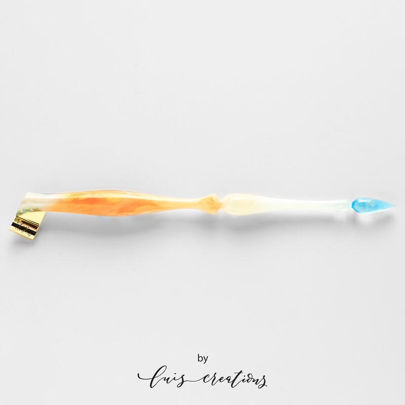 來自澳洲的「Luis Creations」是一家熱衷於製作英文書法相關筆記具的公司,旗下除了市場熱銷的「Moblique 2合1斜/直筆桿」之外,也有少量製作若干特殊的手工斜桿,不僅深受許多同好喜愛,其手感佳,筆身擁有獨特配色,每隻都吸睛十足。「黃金時刻/Golden Hour Rose」便是十分吸睛的代表作之一,筆身金色、白色與淺藍色交錯分布,視覺感豐富,增添書寫時得滿足感。